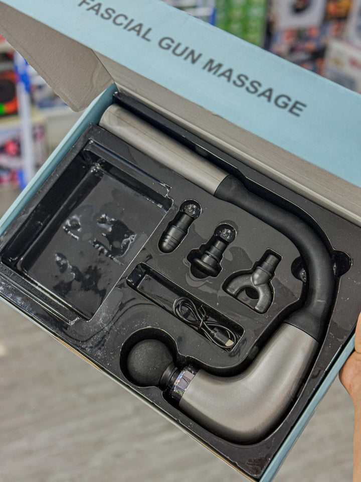 • جهاز مساج كهربائي محمول يشبه “المسدس”، يتميز بتصميم عصري بمقبض منحني مريح للإمساك.