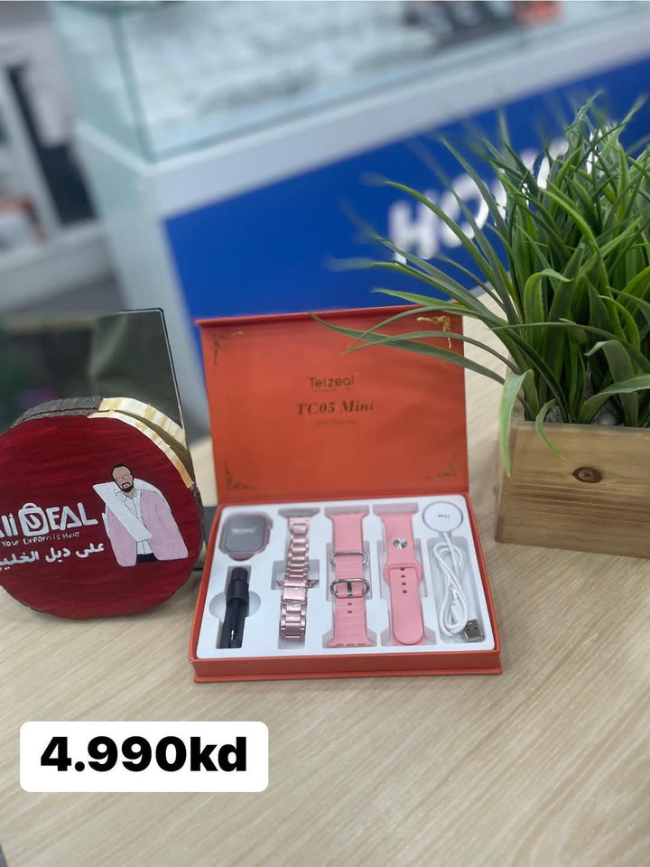 المنتج الظاهر في الصورة هو ساعة ذكية موديل Telzeal TC05 Mini، وتأتي في علبة أنيقة تحتوي على: